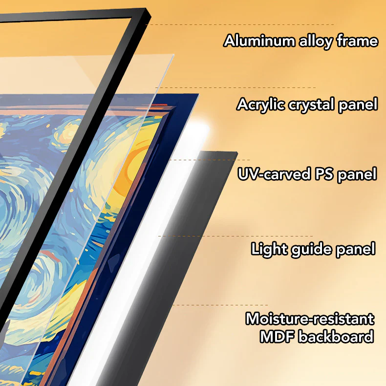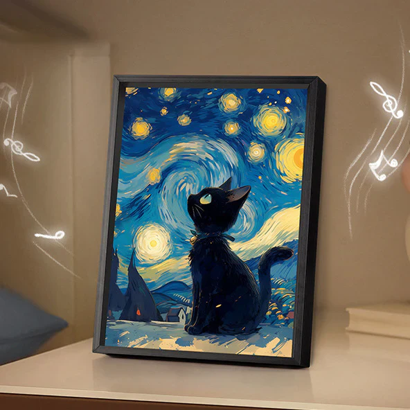 When turned off, it’s a minimalist painting of a quiet cat. Turn it on, and the sky behind the cat glows with dreamy colors - transforming your space instantly.