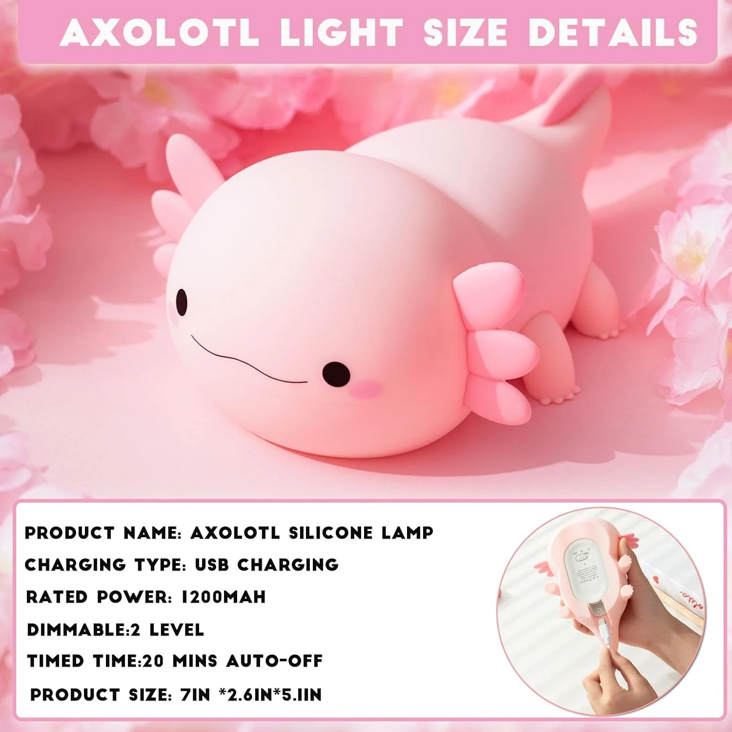 - Safe USB Rechargeable Axolotl Night Light:It's a rechargeable Axolotl Night Light for kids,this fun design Adding whimsical imagination to kids's rooms, it helps make bedtime more funny and comforting,Squishy Super cute soft Silicone Axolotl Night Light also a charming gift for any occasion.