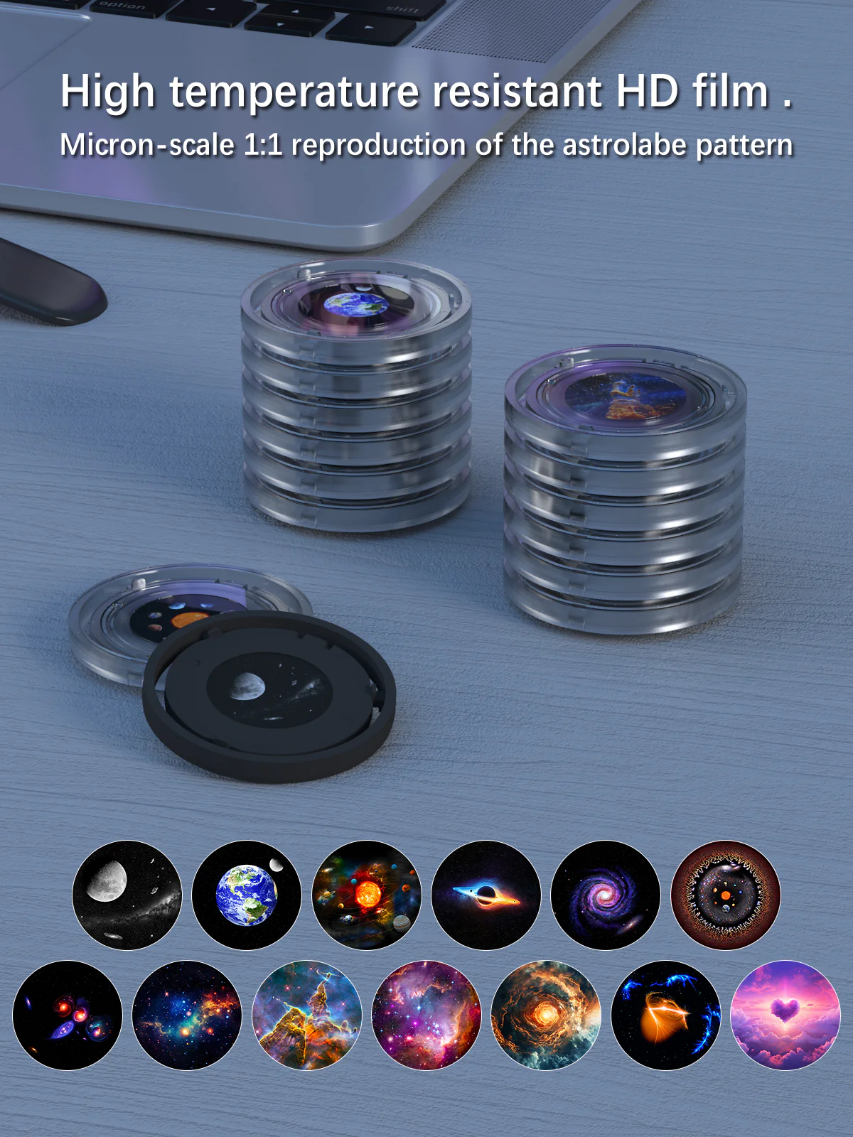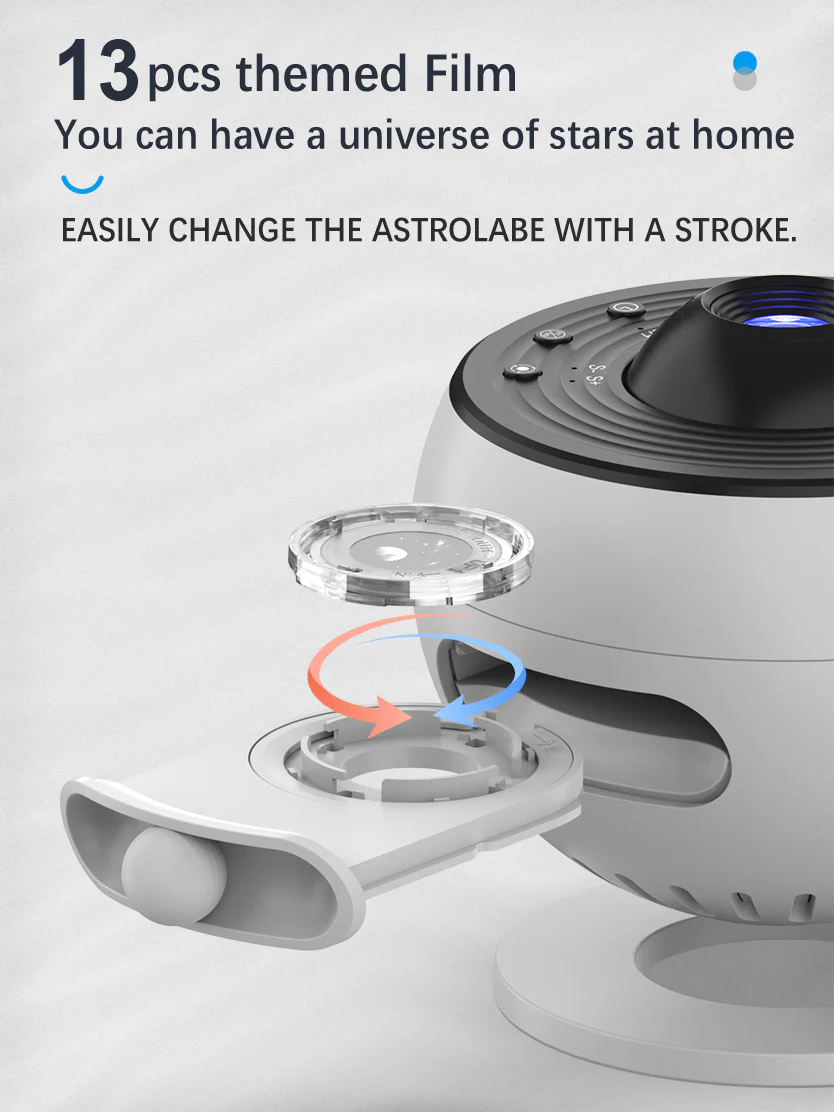 - 【Pro Version 12 in 1 Planetarium Projector】: Please pull the tray handle to replace the slide to switch the galaxy pattern. Transform your room into 13 stunning universe spectacles using film discs. The pattern names are 1: Earth, 2: The Milky Way, 3: Black Hole, 4: Observable Universe 5: Solar System, 6: Small Magellanic Cloud, 7: Valentine's Day, 8: Local Group, 9: Virgo Supercluster, 10: Laniakea Supercluster, 11: Wormhole and 12: Mystic Mountain. 13: Moon (in-built).