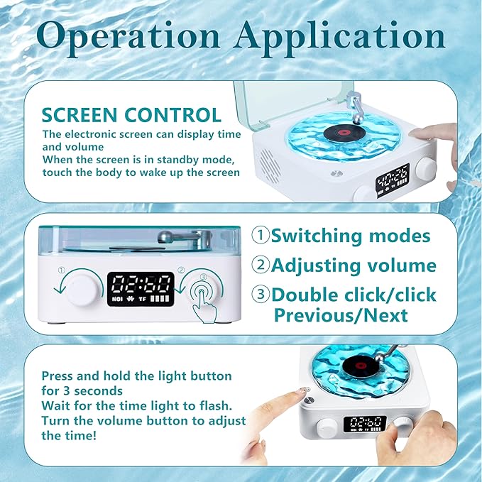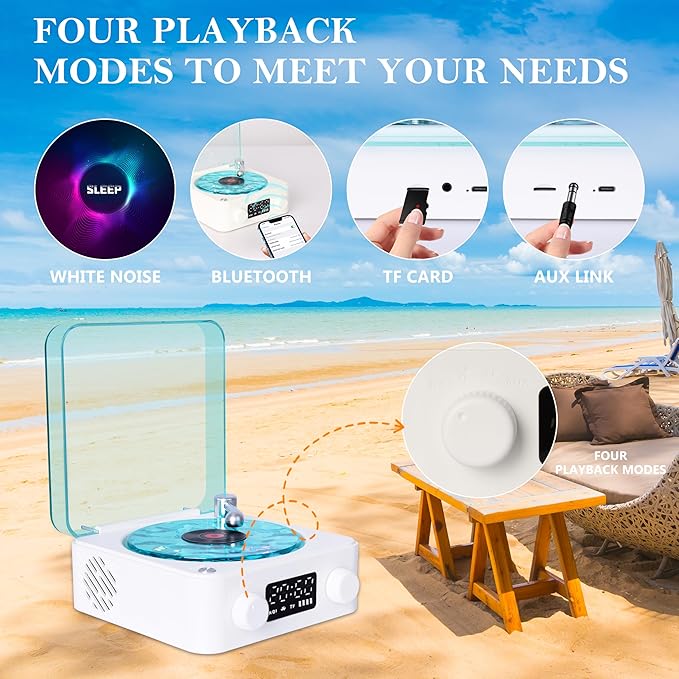 - 【Vinyl record player design】Wireless Bluetooth connection, 360° stereo sound.A Unique and Mesmerizing Visual Experience That Beautifully Combines the Elements of Nature and Technology. Featuring an Immersive Ocean-Inspired Design and Soothing Nature Sounds, adding texture and sophistication to your auditory experience.
